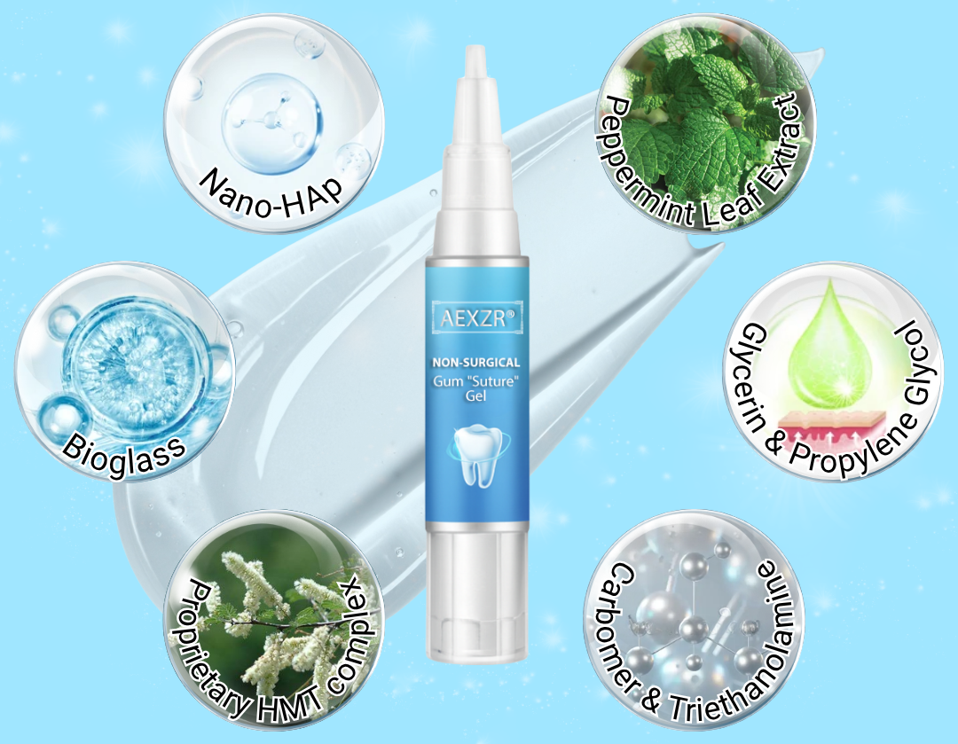 Ingredienti principali: Nano-HAp ottimizzato al 3–5% + vetro bioattivo. Questi elementi bioattivi si integrano biomimeticamente con i minerali di denti e gengive, riempiendo le microlesioni dello smalto e formando rapidamente uno strato protettivo. Ciò porta a una remineralizzazione a livello molecolare, riducendo significativamente la sensibilità dentinale.