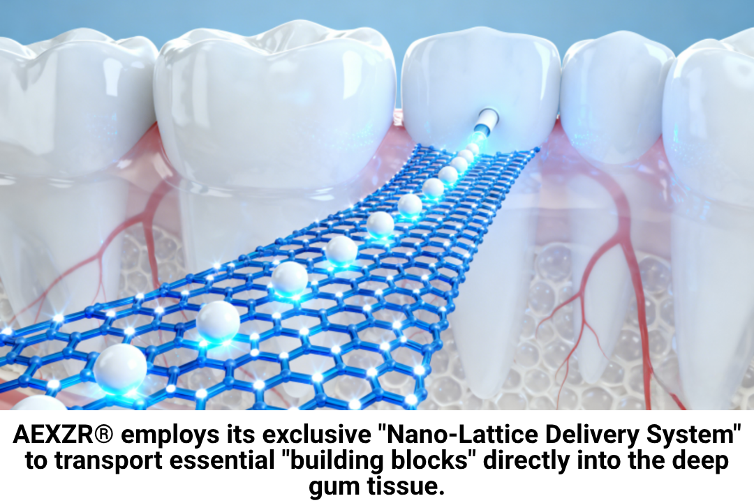 AEXZR® utilizza un esclusivo “sistema di trasporto a nanorete” che veicola i necessari “mattoni” gengivali nei tessuti profondi.