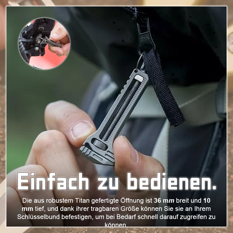 Vores multiværktøj har en kompakt, justerbar skruenøgle, der adskiller det fra resten. Nøglen er lavet af slidstærkt titanium og åbnes til 36 mm bred og 10 mm dyb, hvilket gør den ideel til en række forskellige opgaver. Takket være dens praktiske størrelse kan du også fastgøre den til din nøglering for at have den hurtigt ved hånden, når det er nødvendigt.