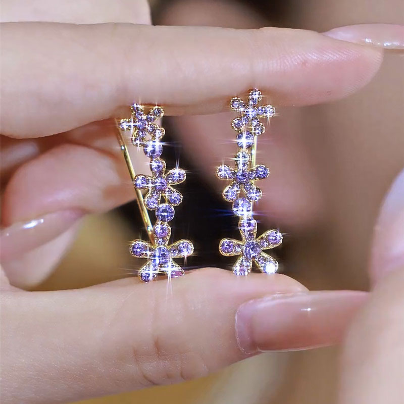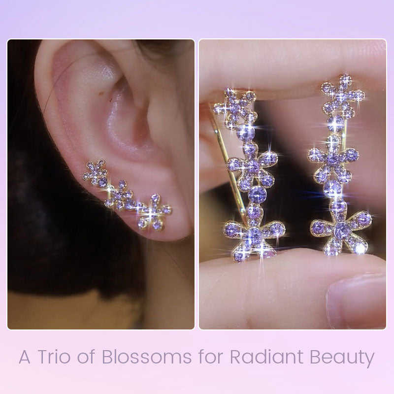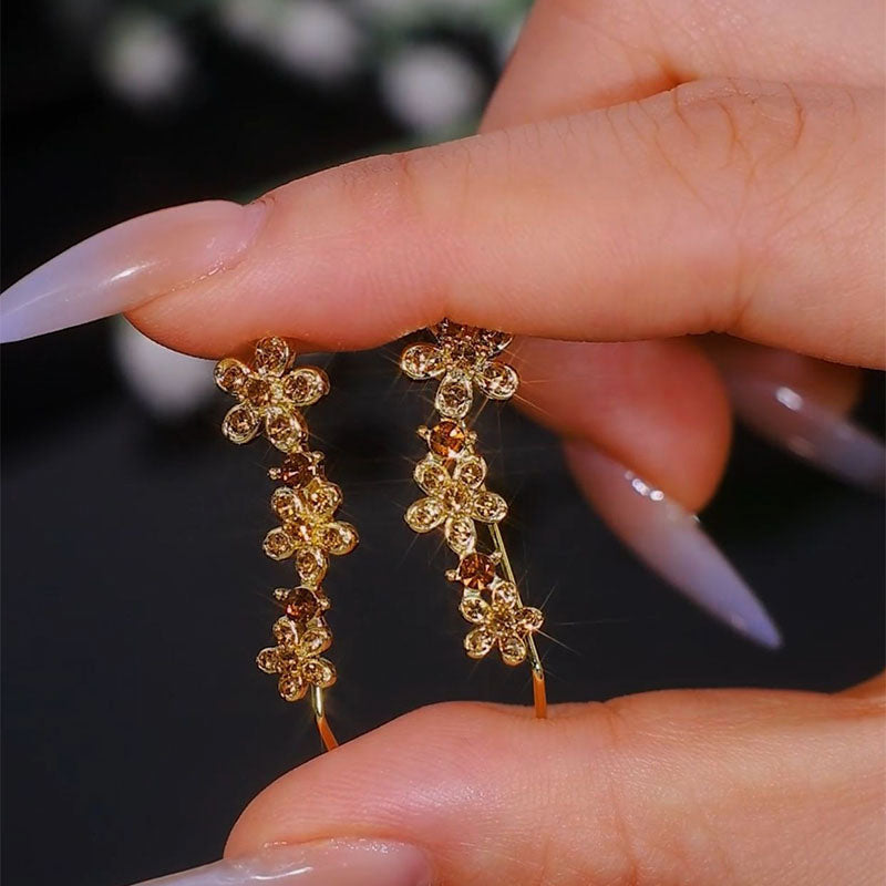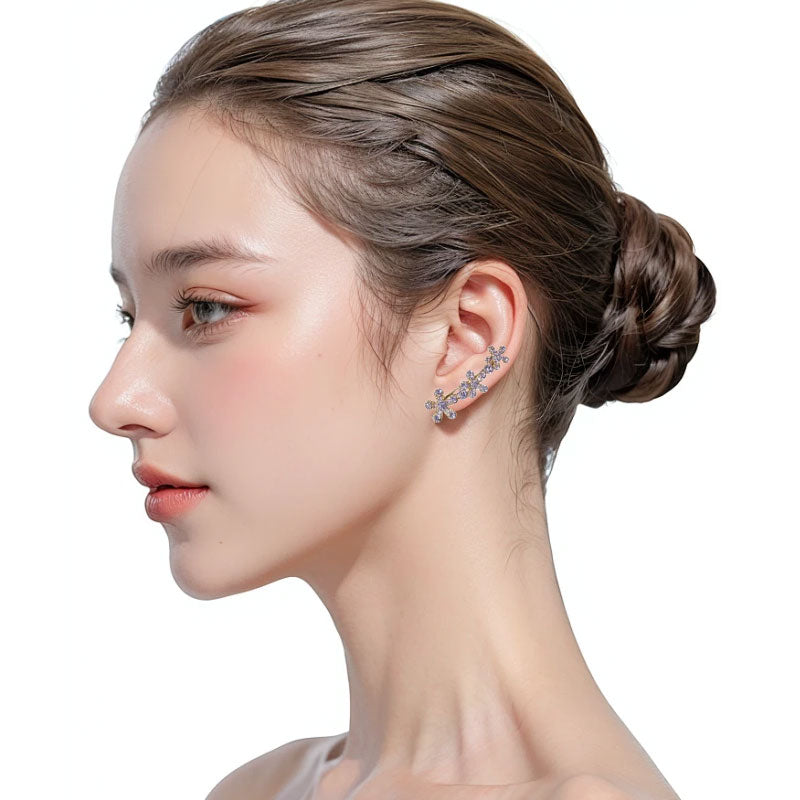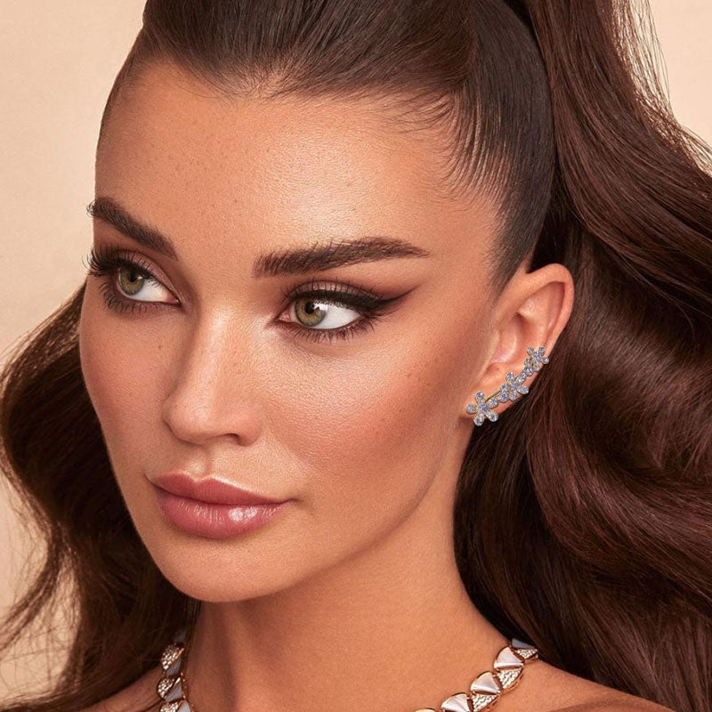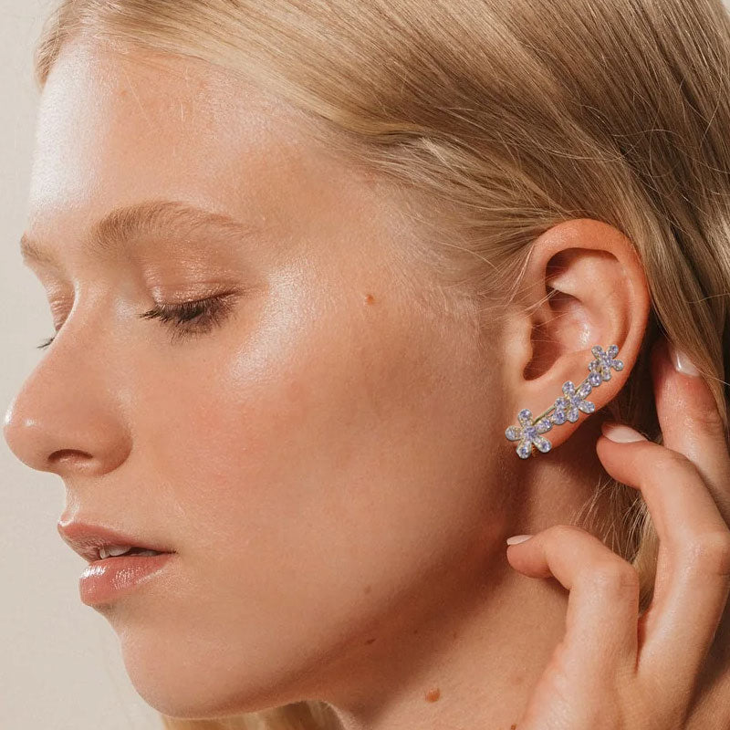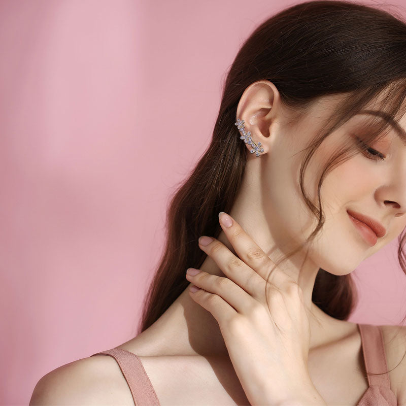 Hver ørering har tre fint forarbejdede blomster, der blomstrer yndefuldt langs kurven. Dette design tilføjer subtil gnistren og dybde og indrammer dit ansigt smukt, samtidig med at det giver dit look en frisk, naturlig fornemmelse.