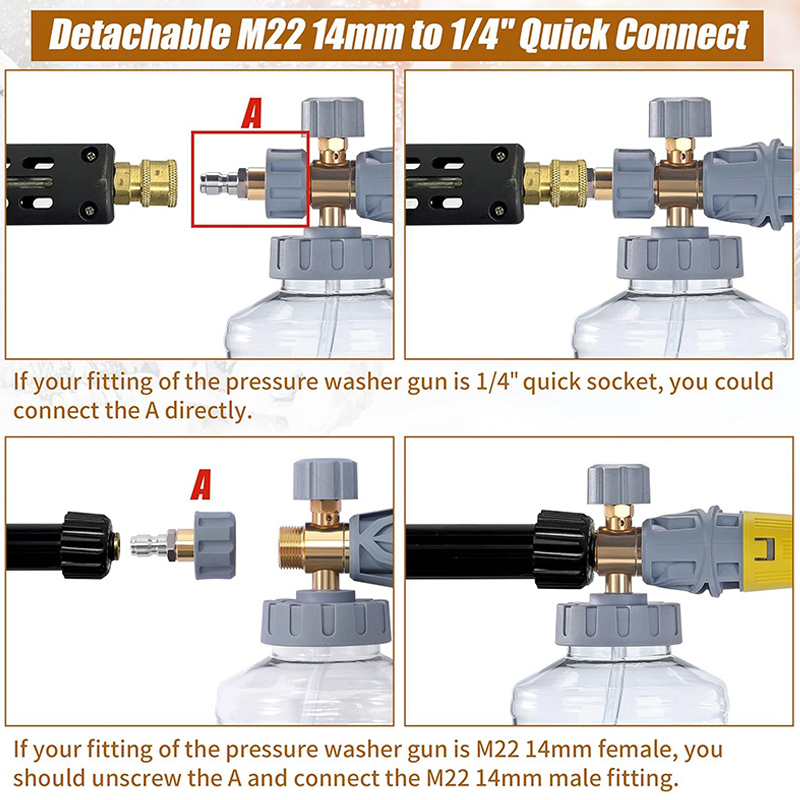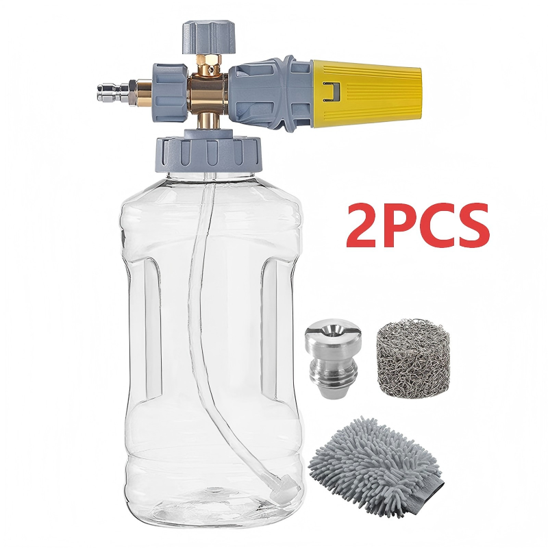 CONNETTORE RAPIDO UNIVERSALE – Dotato di un connettore rapido standard da 1/4" e di un adattatore M22-14mm incluso, questo cannone schiumogeno si collega facilmente a un’ampia varietà di pistole per idropulitrici garantendo una connessione sicura e senza perdite.