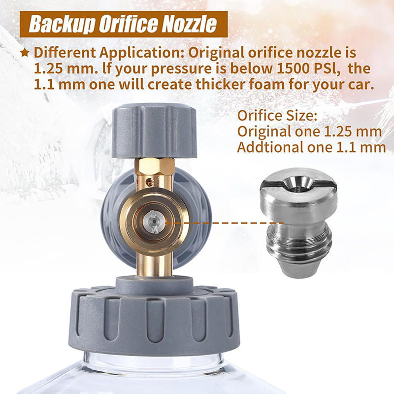 UGELLI A DOPPIO ORIFIZIO – Include un orifizio preinstallato da 1.25mm e un ugello extra da 1.1mm. Questo consente di ottimizzare la produzione di schiuma per la tua specifica idropulitrice, assicurando la massima densità della schiuma anche con unità a PSI più basso.