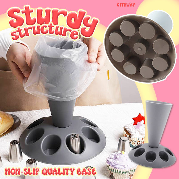 Få en hjælpende hånd, når du pynter kage med denne sprøjtepose og bagedyseholder!