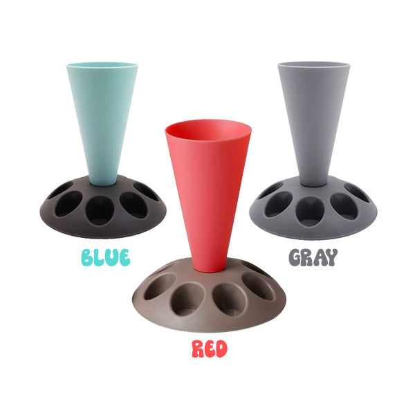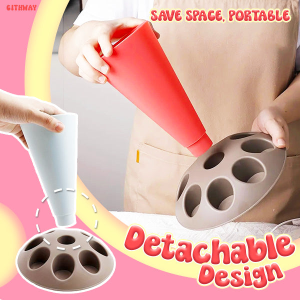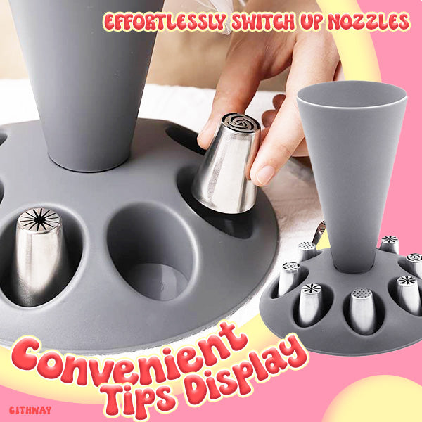 En uundværlig bageværktøjsholder med en aftagelig kegleformet åbning til opbevaring af en sprøjtepose og 8 individuelle åbninger til dine sprøjtespidser. Det giver dig mulighed for at holde dit kagedekorationsværktøj organiseret og altid lukke, mens du bager, for bekvemt dyseskift og tilgængelighed. Det hjælper også, så du nemt kan overføre glasuren eller anden blanding uden spild i en hurtig. bageplads, så du kan opretholde hygiejnen, da du forhindrer risikoen for, at sprøjteposen kommer i klem og dyserne ruller af.