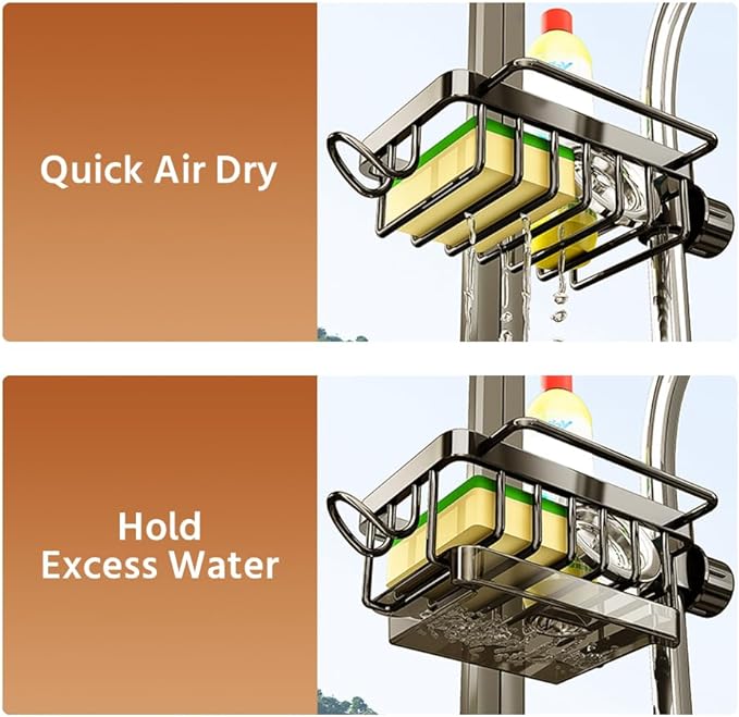 Vandhanens svampeholder kan bruges ikke kun til håndvasken, men også til badeværelset til at opbevare din shampoo, sæbe og andre ting, slippe af med rod og gøre vasken og bordpladerne mere organiserede. Denne vandhaneholder er meget velegnet til dit køkken og badeværelse.