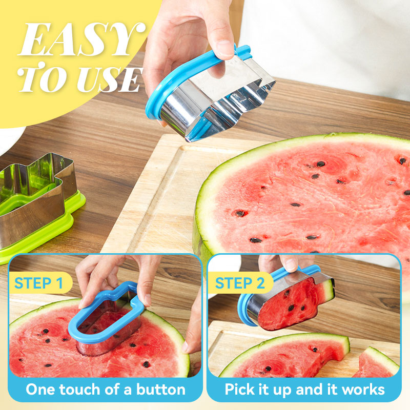 SIKKER - Det fungerer meget glat og er ikke længere et rodet rengøringsproblem. Tåler opvaskemaskine, nem at rengøre og vedligeholde. Sikrere end knive og andre skarpe køkkenredskaber. Skær vandmelon på få sekunder, og de færdige vandmelonterninger kan bruges i frugtfade eller isterninger.
