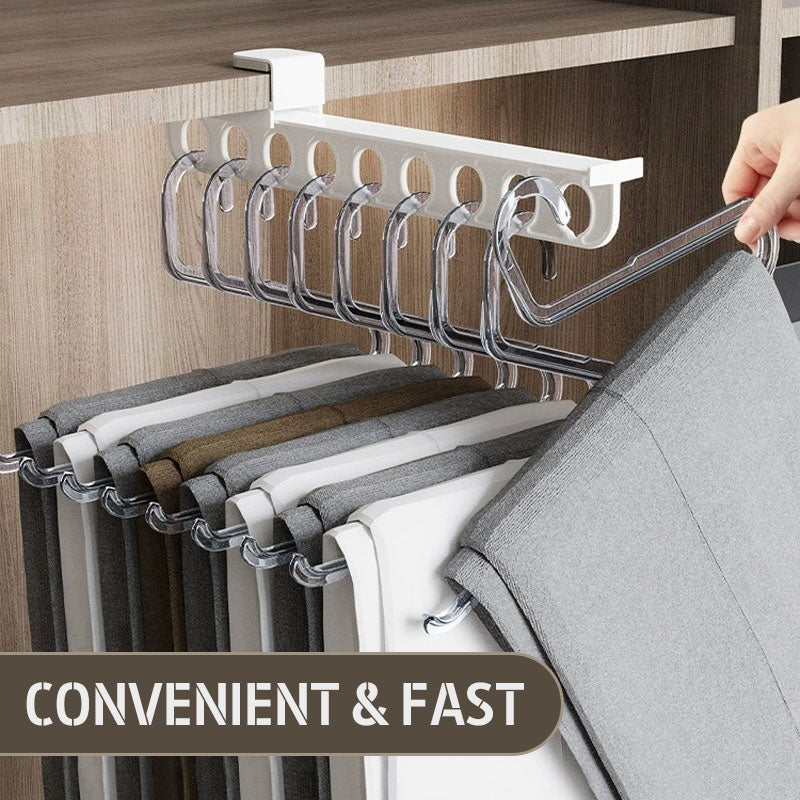 Velkommen til vores butik! Dette hjemmeudtrækbare buksestativ vil give din garderobe mere opbevaringsplads, holde din garderobe pæn og ordentlig og håndtere dine bukser nemt!