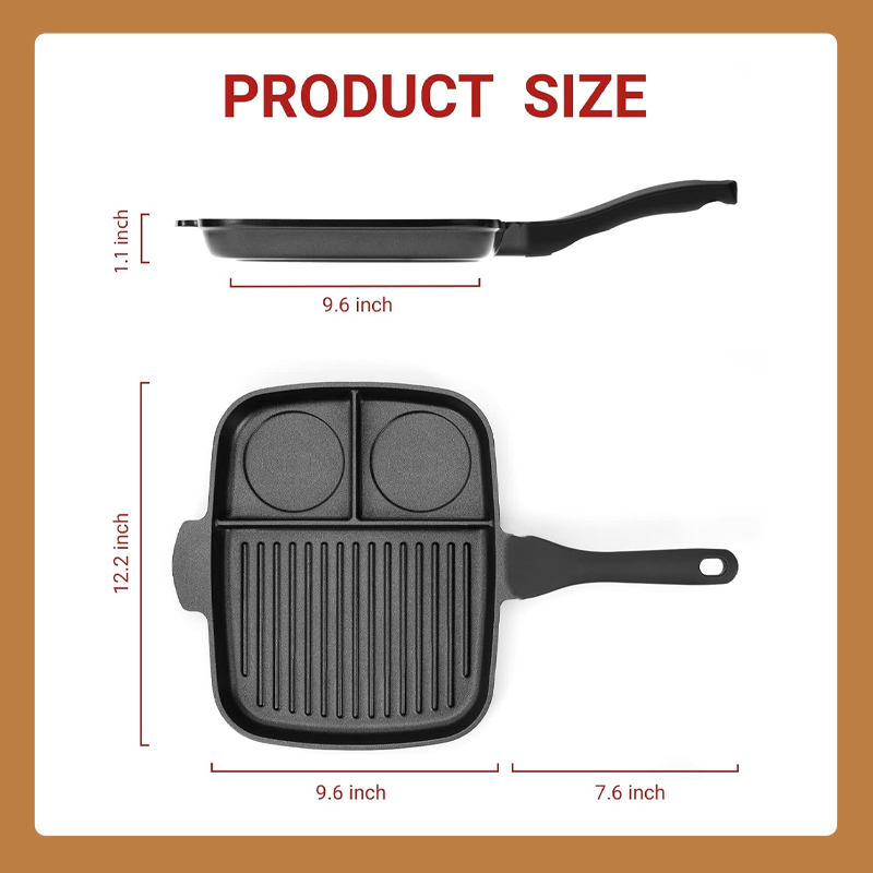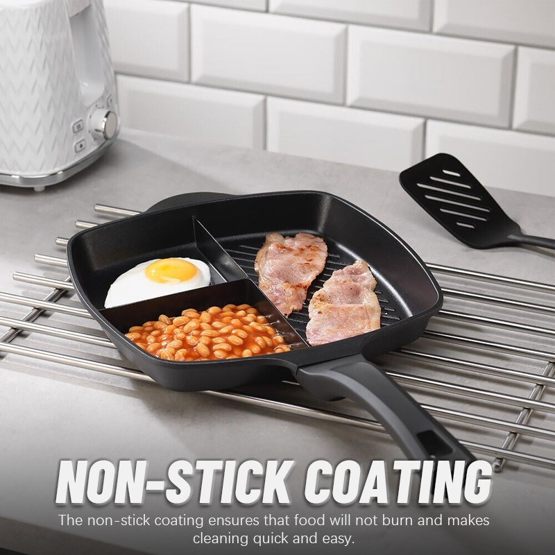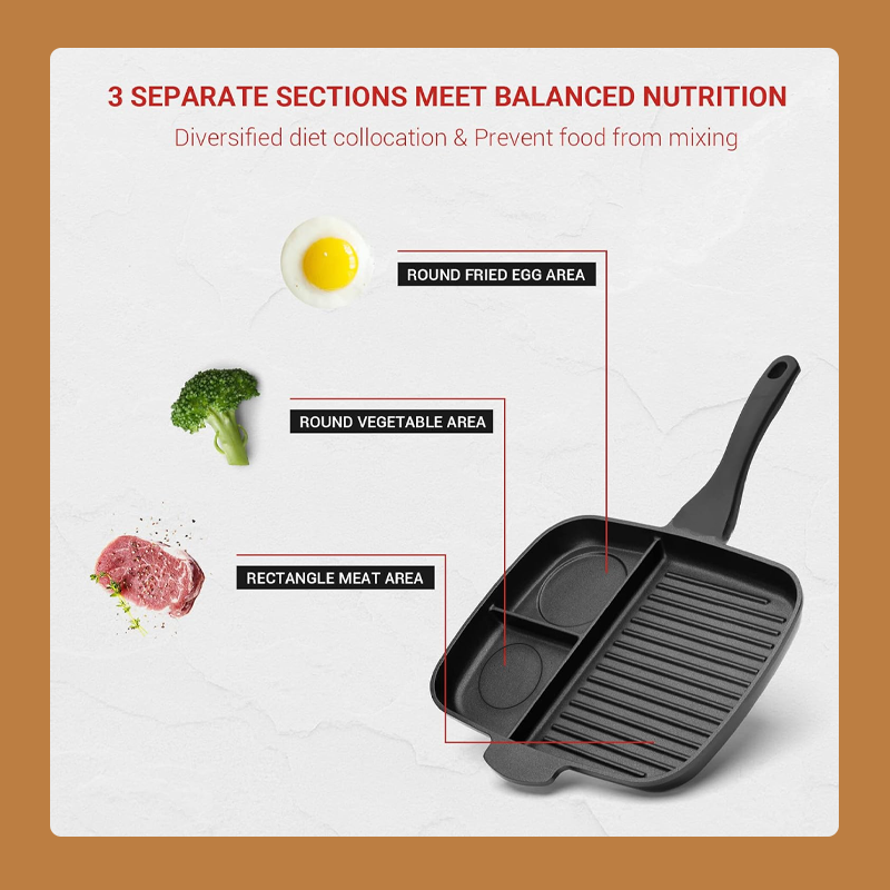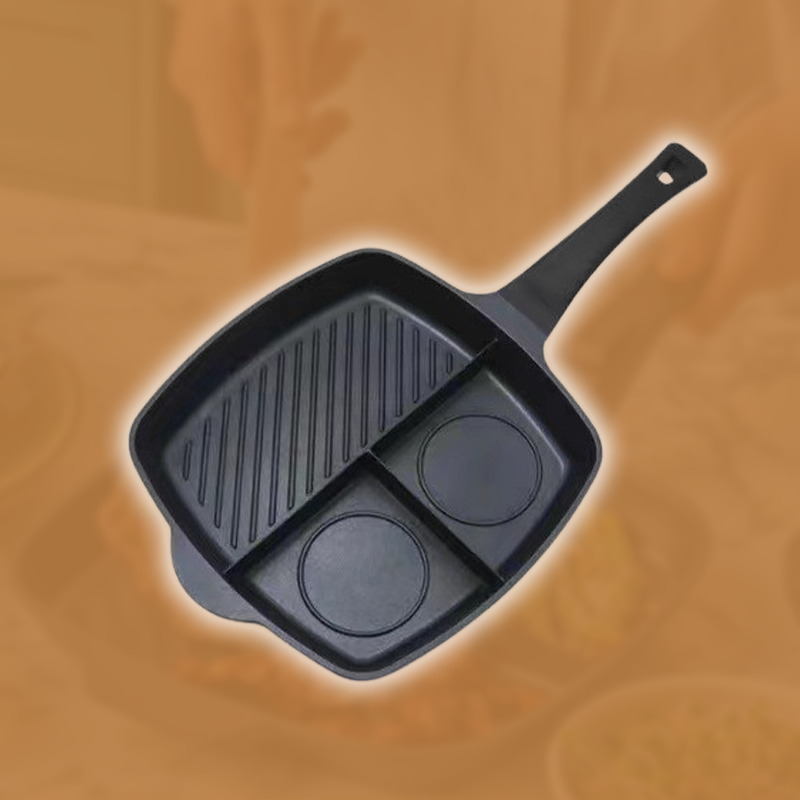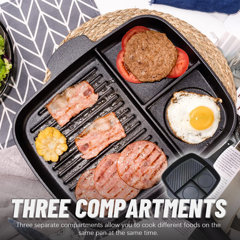 🍳🍳Tre-i-en-steakpande er en unikt designet pande med tre rum, der giver dig mulighed for at tilberede alt, hvad du har brug for, på en enkelt pande.
