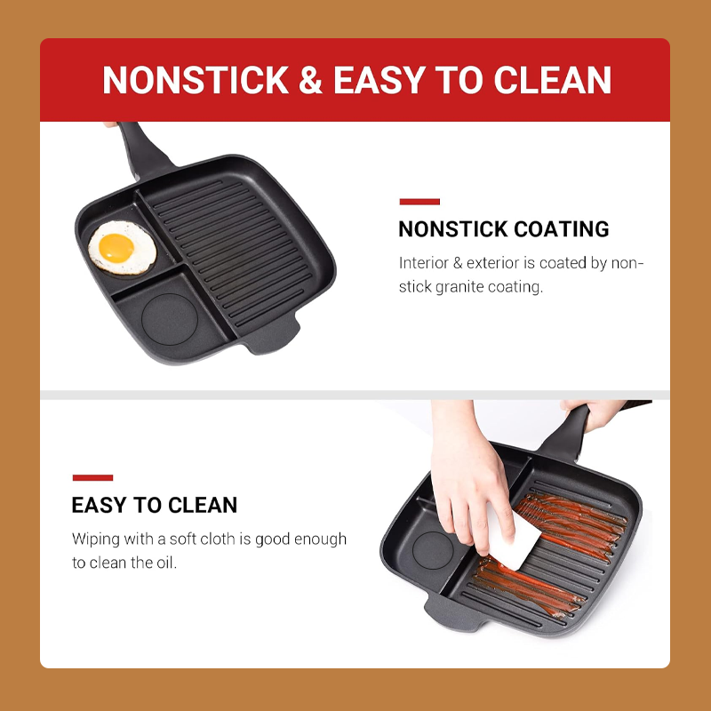 Med Tre-i-en-steakpanden kan du tilberede flere retter på én gang uden besvær. Den jævne varmefordeling og non-stick belægning gør madlavning og rengøring til en leg.